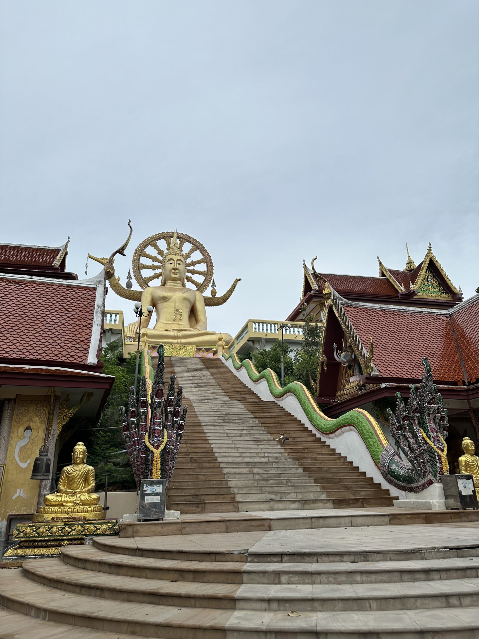 Nach einem kurzen Umstieg in Bangkok landete ich auf der tropischen Insel Koh Samui, die mich mit üppigen Palmenhainen, malerischen Stränden und warmem, türkisblauen Wasser in Empfang nahm. Der erste Ausflug führte mich zum majestätischen Big Buddha, der seit 1972 das Wahrzeichen der Insel ist. Vom Tempel hat man einen tollen Ausblick auf das glitzernde Meer.