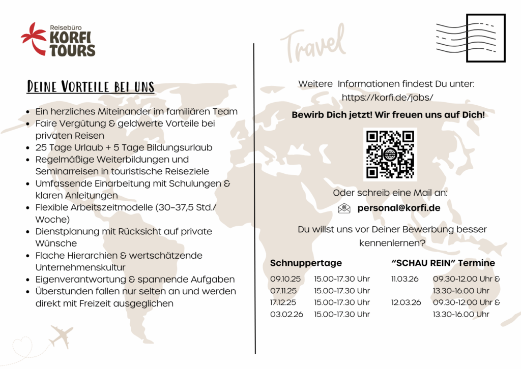 Du interessierst dich für die Welt des Reisens und möchtest wissen, wie man Reisen professionell organisiert und verkauft? Dann bist du bei uns genau richtig! Wir laden dich herzlich zu unserer Schnupperveranstaltung ein. Unsere Auszubildenden geben in einer 2-3 stündigen Veranstaltung einen umfassenden Einblick in ihren Berufsalltag. Sie berichten über die Berufsschule, erzählen über die betriebliche Ausbildung, stellen unsere Reservierungsprogramme und IT-Systeme vor und teilen ihre Erfahrungen von Inforeisen. Nutze die Gelegenheit, um aus erster Hand zu erfahren, was die Ausbildung bei Korfi Tours so besonders macht.